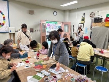加古郡リサイクルプラザ主催のイベントに、リサイクルリーダーとして“牛乳パックを使ったクリスマスハウス作り”体験教室のブースを担当。事前にメンバーで試作を重ねたが、工作は少し難しかったようで、メンバーがサポートしながらの体験教室となった。親子での参加が多く熱心に取り組んでもらい、盛況の体験教室となった。 |