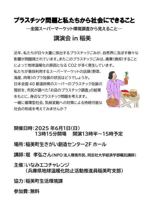 いなみエコチャレンジ自主企画環境講演会開催。 近年、私たちが日々大量に排出するプラスチックごみが、自然界に及ぼす様々な影響が問題視されている中、普段利用するスーパーマーケットの店頭(野菜、海産、肉等)のプラ包装の状況を市民が調査した結果をもとに、講師から身近なプラスチック問題を解説された。 |